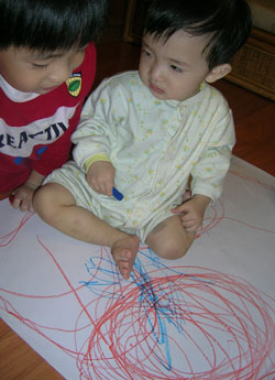 週六晚上, 哥哥主動說要畫圖. 畫在大張紙上果真也是有吸引力的.